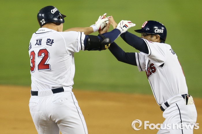 (서울=포커스뉴스) 28일 서울 잠실구장에서 열린 2016 프로야구 SK-두산 경기 9회말 1사 1,2루에서 역전 끝내기 우월 3점홈런을 날린 두산 김재환이 강동우 코치와 하이파이브하고 있다.