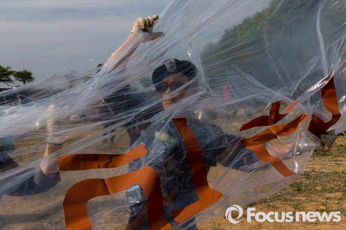 (파주=포커스뉴스) 29일 오후 경기 파주 낙하IC 인근에서 탈북자단체인 자유북한운동연합이 북한에 핵과 미사일을 포기하고 국제사회 일원으로 참여할 것을 촉구하는 내용의 대북전단을 날려보내기 위해 수소가스를 주입하고 있다.