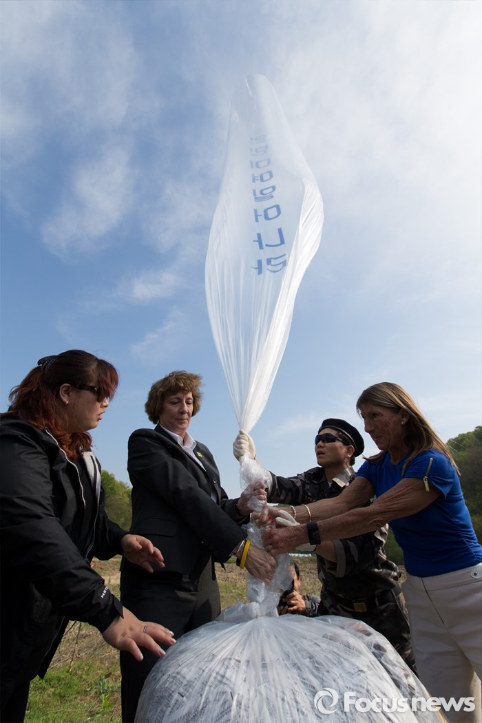 (파주=포커스뉴스) 29일 오후 경기 파주 낙하IC 인근에서 수잔 숄티 디펜스포럼 대표가 대북전단을 날려보내기 위해 준비하고 있다.