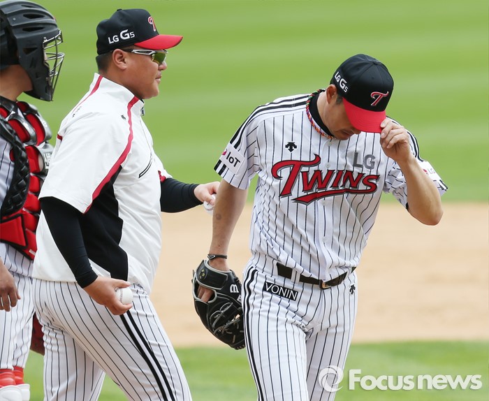 (서울=포커스뉴스) 1일 서울 잠실구장에서 열린 2016 프로야구 kt-LG 경기에서 LG 선발투수 봉중근이 4회초 kt 박기혁에게 안타를 맞은뒤 강판되며 마운드를 내려가고 있다.