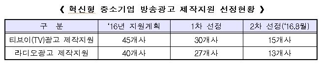 아울러 중소기업청과 관련 정보를 상호 공유하고 우대방안을 협의하는 등 방송과 관련해 중소기업에 대한 지원이 더욱 효과적으로 이루어질 수 있도록 노력할 것이라고 밝혔다.혁신형 중소기업 방송광고 제작지원 선정현황.<표제공=방통위>