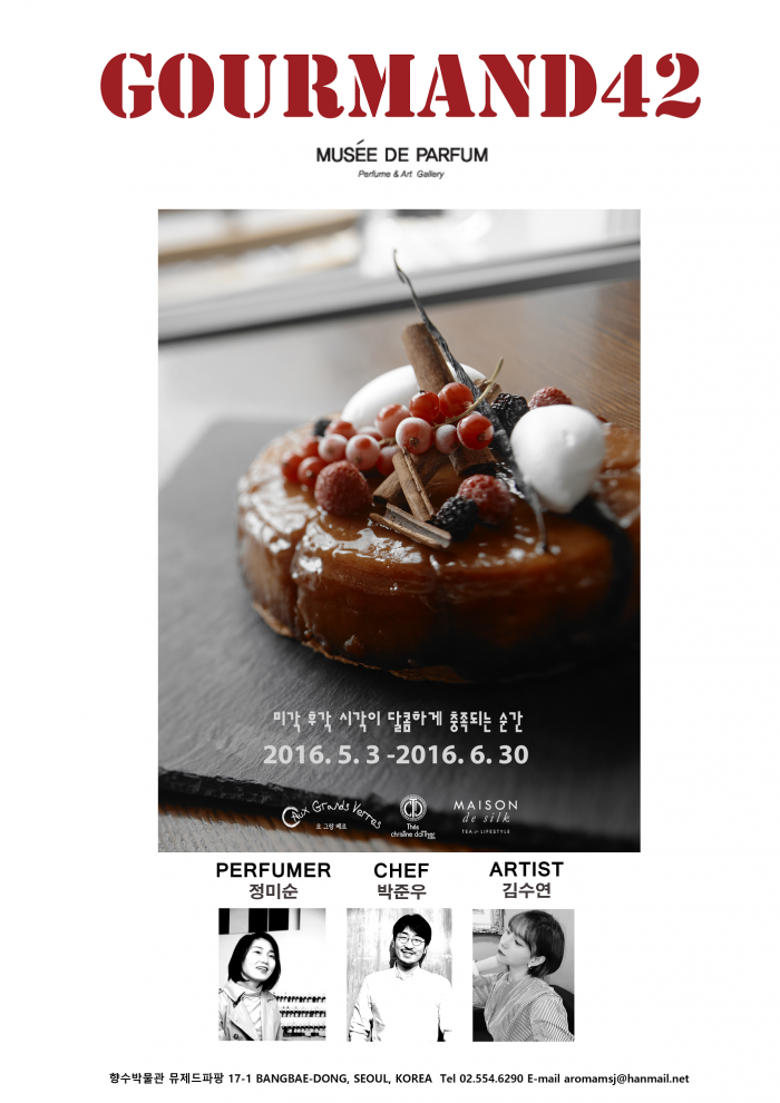 전시는 5월3일부터 6월30일까지 2달간 열리며 5월2일 오후 4시 박준우 쉐프, 김수연 작가, 크리스틴다트너코리아 우명완 대표가 참석하는 프레스 대상 오프닝 리셉션이 예정되어 있다.'구르망 42' 전시회 포스터.<사진제공=뮤제드파팡>