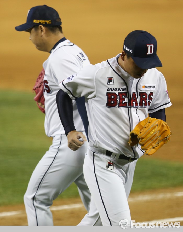 (서울=포커스뉴스) 28일 서울 잠실구장에서 열린 2016 프로야구 SK-두산 경기 9히 2사 1루에서 두산 투수 정재훈이 마운드를 내려가고 이현승이 마운드로 올라가고 있다.