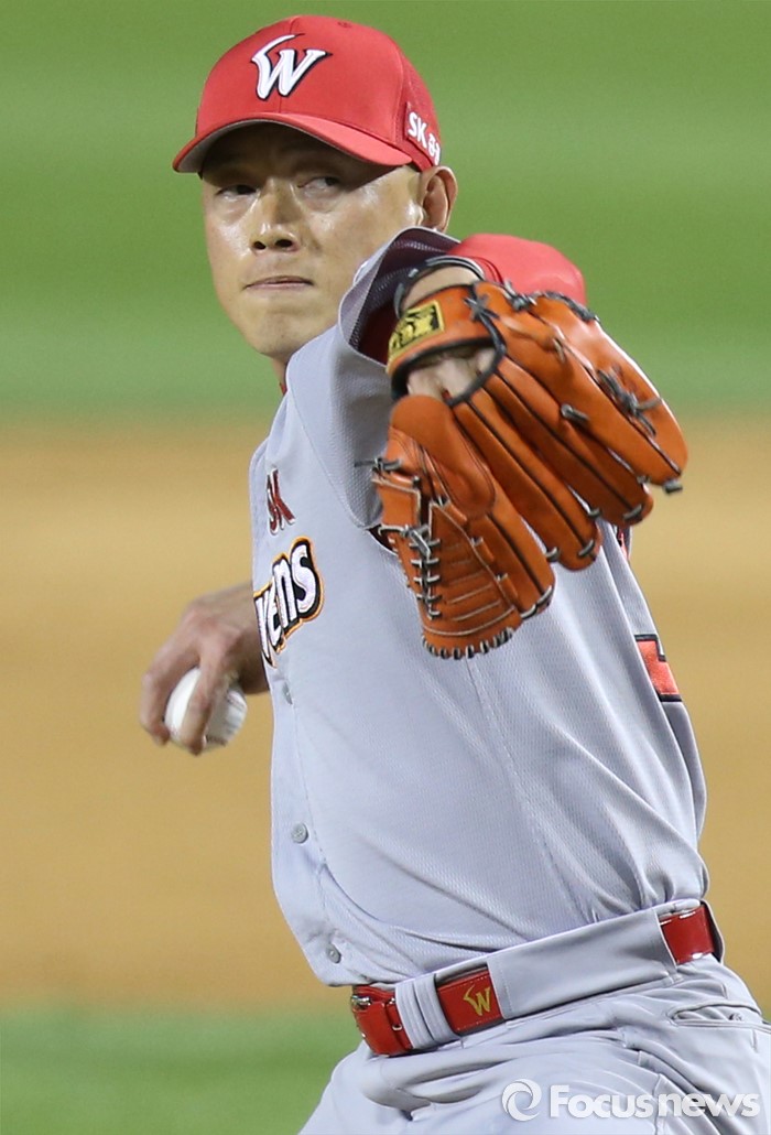 (서울=포커스뉴스) 27일 서울 잠실구장에서 열린 2016 프로야구 SK-두산 경기에서 SK 투수 박정배가 8회 2사 1,3루에서 마운드에 올라 투구하고 있다.