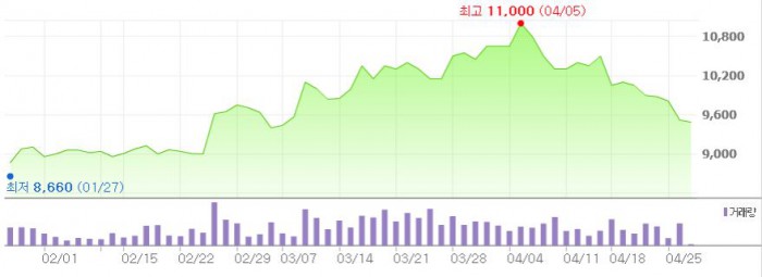 그는 그러면서 "일회성 요인이 제거되는 2분기부터 영업이익과 순이익 모두 정상화 될 전망"이라고 덧붙였다.최근 3개월간 대교 주가 추이 <그래픽출처=네이버>