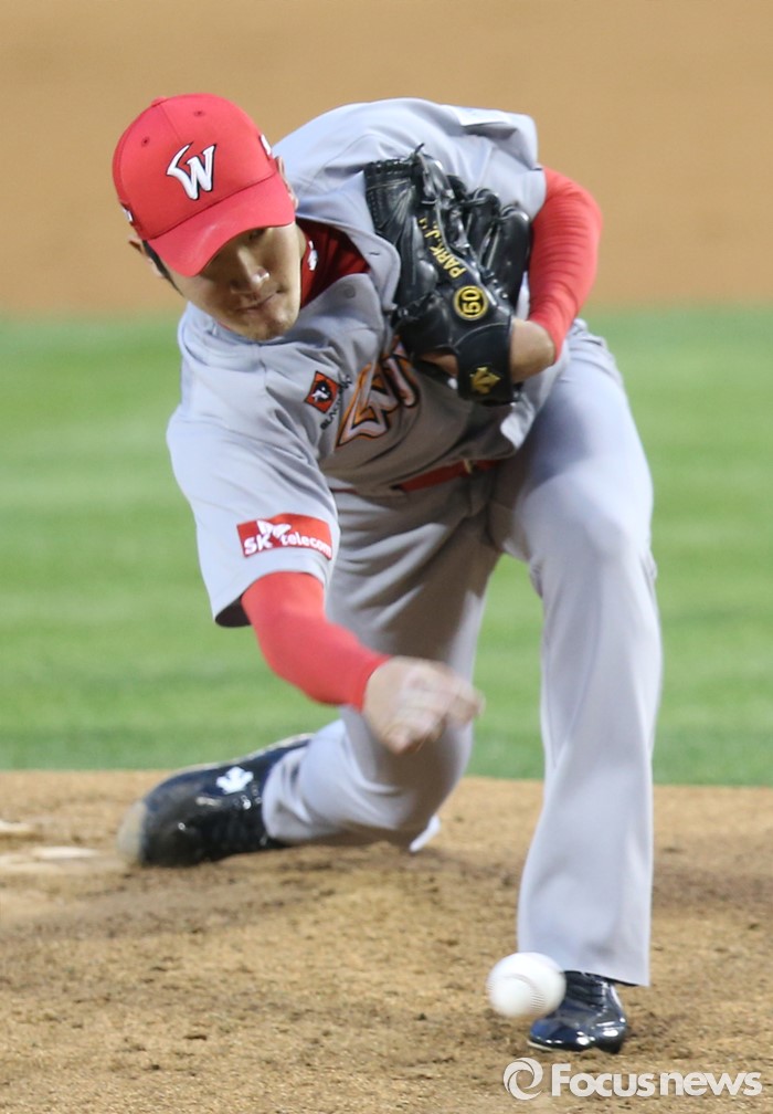 (서울=포커스뉴스) 27일 서울 잠실구장에서 열린 2016 프로야구 SK-두산 경기에서 1회말 SK 선발투수 박종훈이 투구하고 있다.