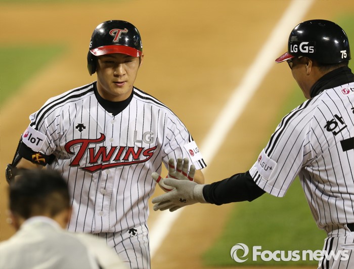 (서울=포커스뉴스) 29일 서울 잠실구장에서 열린 2016 프로야구 kt-LG 경기 5회말 LG 선두타자 오지환이 동점 우월 솔로 홈런을 치고 홈인하고 있다.