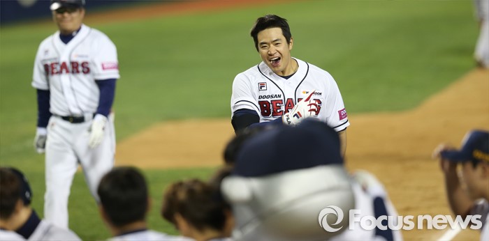 (서울=포커스뉴스) 28일 서울 잠실구장에서 열린 2016 프로야구 SK-두산 경기 9회말 1사 1,2루에서 역전 끝내기 우월 3점홈런을 날린 두산 김재환이 환호하며 홈인하고 있다.