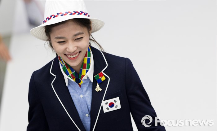 (서울=포커스뉴스) 27일 오후 서울 노원구 태릉선수촌에서 열린 제31회 리우하계올림픽대회 D-100일 미디어데이에서 펜싱 국가대표 김지연이 단복 공개 리허설을 하고 있다.