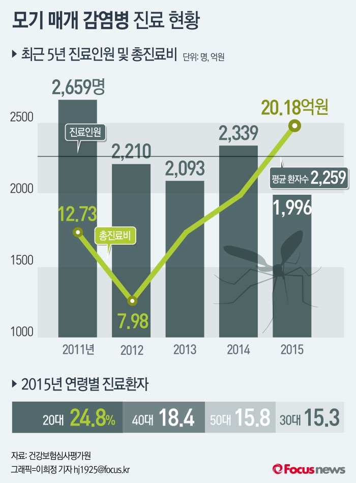 1일 건강보험심사평가원(원장 손명세, 이하 ‘심사평가원’)이 ‘모기 매개 감염병'에 대해 최근 5년간(2011년~2015년) 심사 결정자료(건강보험 및 의료급여)를 분석한 결과에 따르면 진료인원은 연평균 2259명 수준이다.