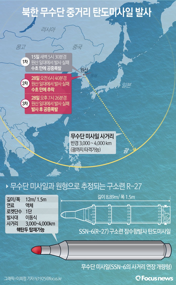 (서울=포커스뉴스) 합동참모본부는 28일 오전에 이어 오후 7시 26분 쯤 원산지역에서 무수단 1발을 추가로 발사하였으나 실패한 것으로 추정된다고 밝혔다. 무수단 미사일은 구 소련의 SSN-6(R-27) 잠수함발사 탄도미사일의 사거리를 연장한 개량형으로 길이는 12m, 무게는 18톤 가량 된다.