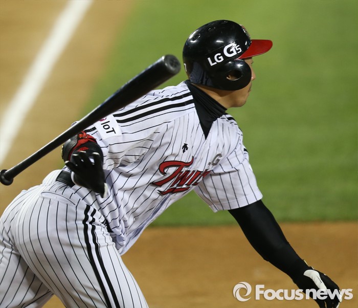 (서울=포커스뉴스) 29일 서울 잠실구장에서 열린 2016 프로야구 kt-LG 경기 7회말 1사 만루에서 LG 이병규가 2타점 우전안타를 치고 있다.