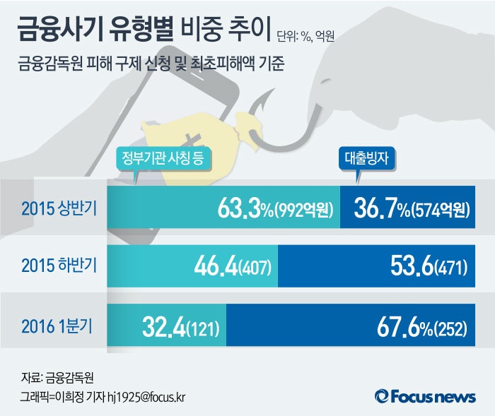 (서울=포커스뉴스) 금융감독원에 따르면 2016년 1분기 금융사기 피해액은 373억원이었고 이 가운데 대출사기 피해액은 252억원으로 전체의 67.6%를 차지했다.