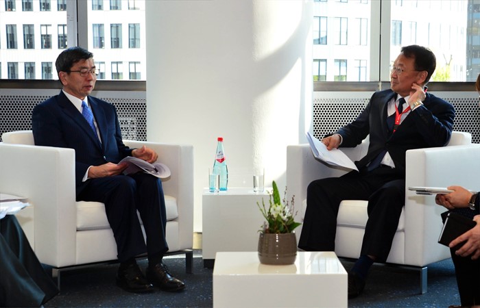 (서울=포커스뉴스) 유일호 부총리 겸 기획재정부 장관이 2일(현지시간) 독일 메세 프랑크푸르트에서 나카오 타케히코 ADB(아시아개발은행)총재를 예방, 면담을 갖고 있다. <사진제공=기획재정부>