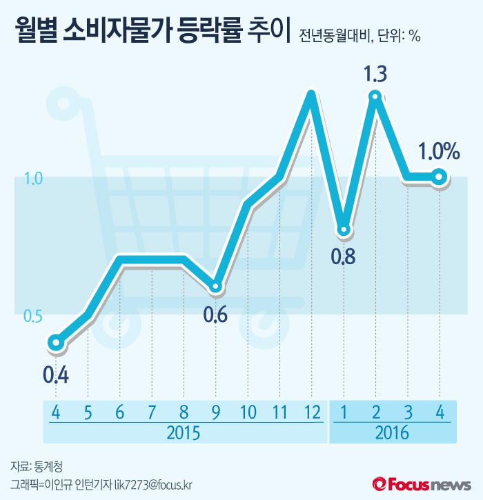 (서울=포커스뉴스) 3일 통계청은 4월 소비자물가가 전년 동월 대비 1.0% 상승했다고 밝혔다.