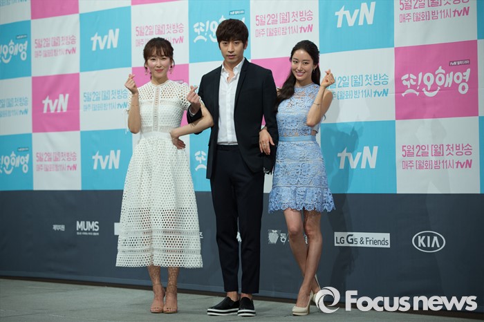 드라마 '또 오해영'은 동명이인의 잘난 오해영 때문에 인생이 꼬인 여자 오해영과, 미래를 볼 수 있는 능력을 지닌 남자 박도경 사이에서 벌어지는 로맨스를 담은 드라마. '연애 말고 결혼', '슈퍼대디 열' 등을 연출한 송현욱 감독과 '올드미스 다이어리', '청담동 살아요'의 박해영 작가가 손을 잡았다. 매주 월, 화 오후 11시 방송.(서울=포커스뉴스) 22일 오후 서울 강남구 임피리얼 팰리스호텔에서 열린 tvN 월화드라마 '또! 오해영' 제작발표회에 참석한 배우 서현진(왼쪽부터), 에릭, 전혜빈이 포토타임을 갖고 있다. 2016.04.22 김유근 기자