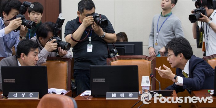 (서울=포커스뉴스) 유승민(오른쪽) 무소속 의원이 3일 오전 서울 여의도 국회에서 열린 국방위원회 전체회의에 참석해 안규백 더불어민주당 의원과 대화하고 있다.