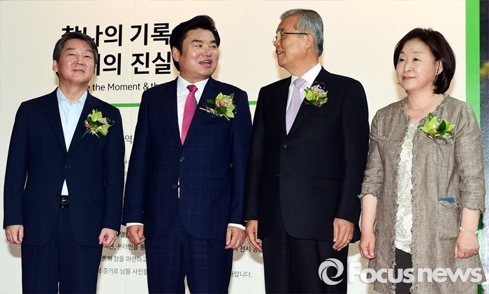 (서울=포커스뉴스) 3일 오전 서울 강남구 코엑스에서 열린 '52회 한국보도사진전 개막식'에 참석한 안철수(왼쪽부터) 국민의당 상임공동대표, 원유철 새누리당 대표최고위원 권한대행, 김종인 더불어민주당 비대위 대표, 심상정 정의당 상임대표가 대화하고 있다. '찰나의 기록, 시대의 진실'을 주제로 진행된 이번 전시는 시대의 진실을 기록한다는 사명감으로 역사의 현장을 묵묵히 지키며 취재한 수백만 컷 중 선정된 150여점과 '현장의 사진기자', '역대 대상 수상작' 등 250여점의 사진이 전시된다.