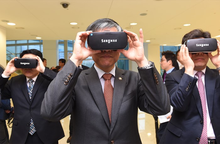(서울=포커스뉴스) 최상목 기획재정부 차관이 3일 서울 마포구 상암동 누리꿈스퀘어에서 VR기기를 이용한 콘텐츠 시연을 하고 있다. <사진제공=산업통상자원부>