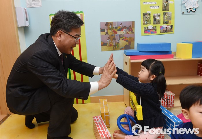 (서울=포커스뉴스) 송언석 기획재정부 차관이 취업여성의 경제활동 및 육아지원과 관련해 3일 서울 서초구 샛별 어린이집을 방문, 시설을 둘러보며 아이들과 대화를 나누고 있다. <사진제공=기획재정부>