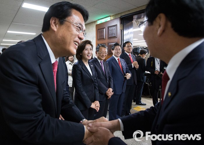 (서울=포커스뉴스) 정진석(왼쪽), 나경원(왼쪽 두번째), 유기준(오른쪽 두번째)원내대표 후보자 및 정책위의장 후보자들이 3일 오후 서울 여의도 국회에서 열린 새누리당 원내대표, 정책위의장 선출 및 당선자 총회에 참석해 의원들과 인사하고 있다.