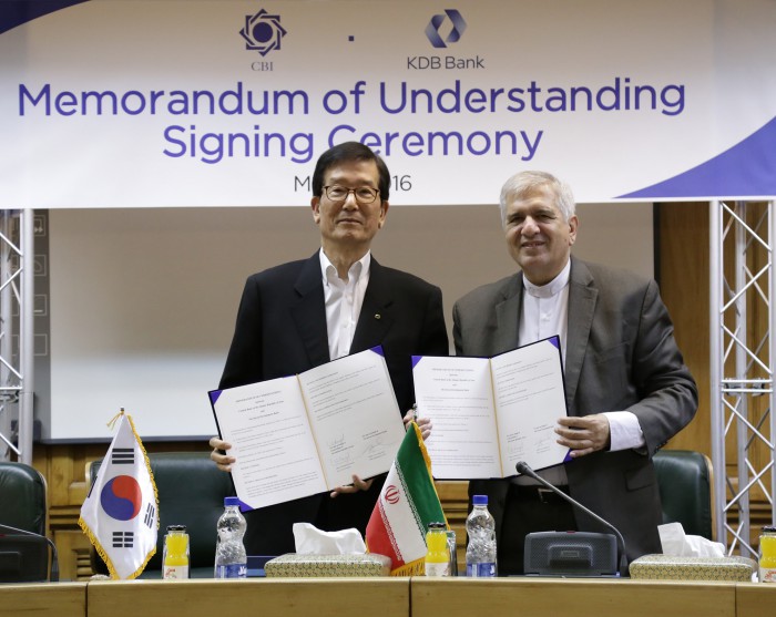 한편, 산업은행은 지난 3월 이란 테헤란 현지에 주재원을 파견하는 등 본격적으로 진출을 모색 중이다.(사진 왼쪽부터) 이동걸 산업은행 회장과 이란중앙은행 골라말리 캄얍(Gholamali Kamyab) 부총재가 업무협약을 체결하고 기념촬영을 하고 있다.<사진제공=산업은행>