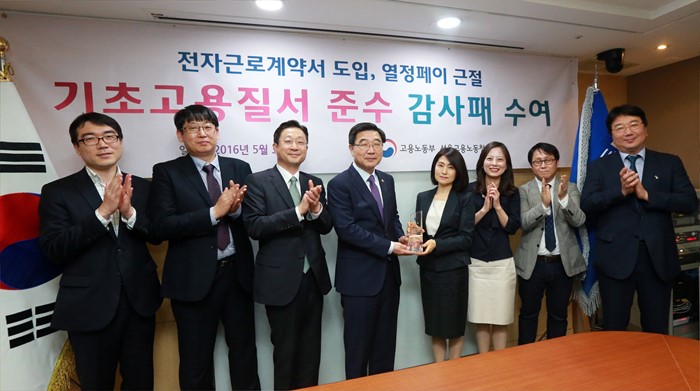 (t서울=포커스뉴스) 이기권 고용노동부 장관이 3일 오후 서울 중구 서울고용노동청에서 전자근로계약서를 선제적으로 도입하는 등 기초고용질서 준수에 적극적으로 노력한 최인녕 알바천국 대표에게 감사패를 수여하고 있다. <사진제공=고용노동부>