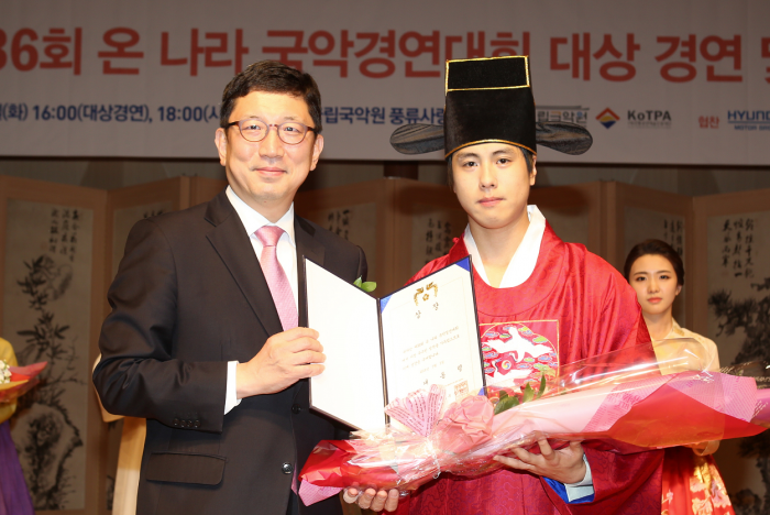 김종식 심사위원장은 "대상 경연자 모두 대상감이 될 만큼 수준이 상당했다"며 "이후에도 실력있는 연주자들의 많은 참가를 통해 좋은 경연이 이어지길 바란다"고 전했다.최태훈(오른쪽) 씨가 3일 오후 제36회 국립국악원 온나라 국악 경연대회에서 대상을 수상한 뒤 시상자인 박영국 문화체육관광부 문화예술정책실장과 기념사진을 찍고 있다.<사진제공=국립국악원>