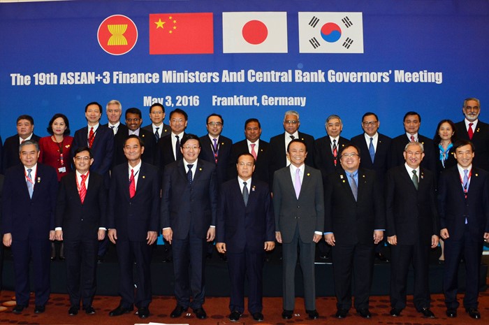 (서울=포커스뉴스) ADB연차 총회 참석차 독일 프랑크푸르트를 방문 중인 유일호(뒷줄 왼족 일곱 번째) 부총리 겸 기획재정부 장관이 5월 3일(현지시간) 메리어트호텔에서 열린 제19차 ASEAN+3 재무장관 및 중앙은행 총재 회의에 참석해, 각국 대표들과 기념촬영을 하고 있다. <사진제공=기획재정부>