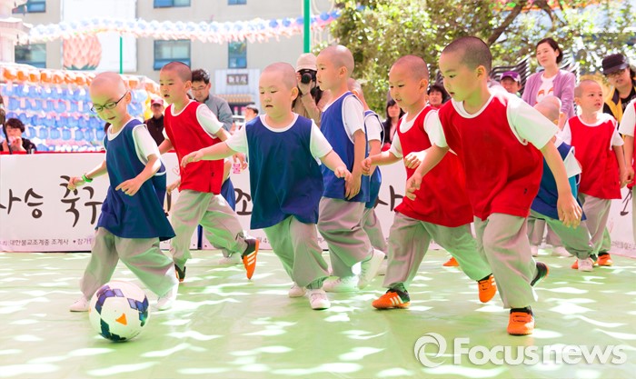(서울=포커스뉴스) 4일 오후 서울 종로구 조계사 대웅전 앞에서 조계사와 홍법사 동자스님들이 축구대회에 참가해 실력을 겨루고 있다.