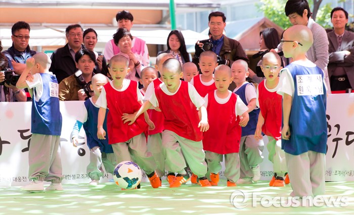 (서울=포커스뉴스) 4일 오후 서울 종로구 조계사 대웅전 앞에서 조계사와 홍법사 동자스님들이 축구대회에 참가해 실력을 겨루고 있다.
