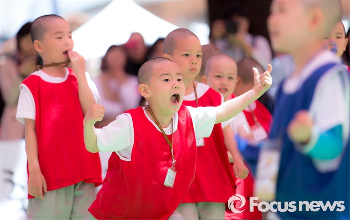 (서울=포커스뉴스) 4일 오후 서울 종로구 조계사 대웅전 앞에서 조계사와 홍법사 동자스님들이 축구경기에 앞서 신경전을 벌이고 있다.