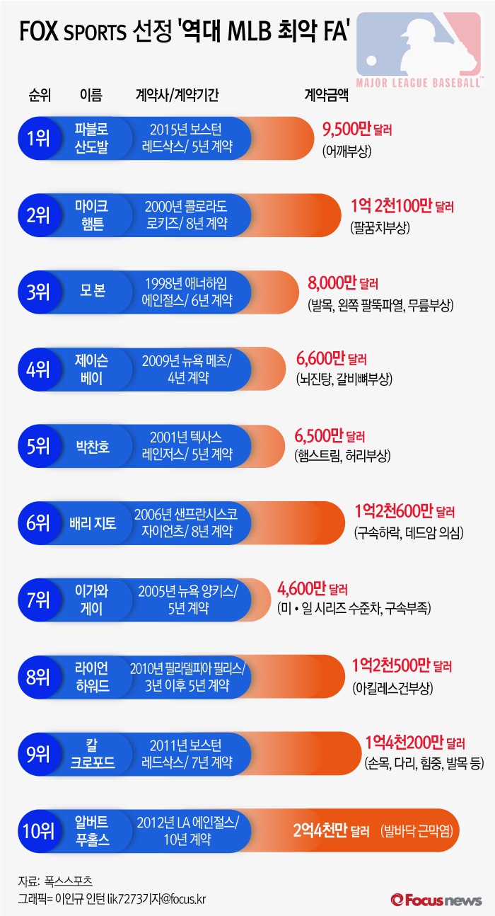 (서울=포커스 뉴스) 미국 스포츠 전문매체 ‘폭스스포츠’는 3일(현지시간) 역대 메이저리그 최악 FA '톱 10'을 선정했다. 1위로 꼽은 최악의 선수는 보스턴 레드 삭스의 파블로 산도발(30)이었고, 박찬호(43)도 5위라는 불명예를 안으며, 메이저리그 역사상 최악의 자유계약 선수(FA)에 이름을 올렸다.