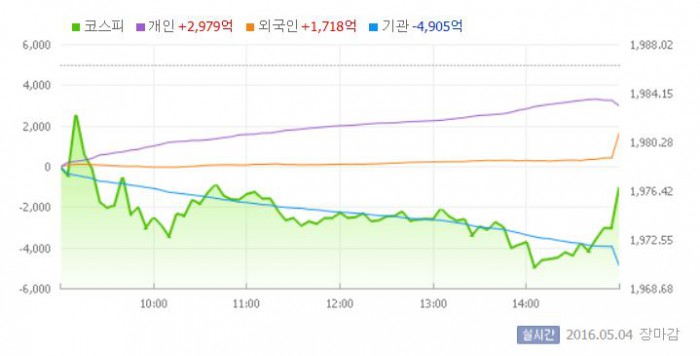 이날 코스피는 전일 대비 0.47% 하락한 1977.09로 장을 시작했다. 이후 지수는 기관의 대규모 매도세로 1970선 부근에서 등락을 반복했다.