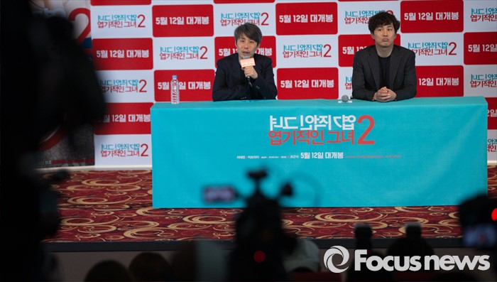 (서울=포커스뉴스) 4일 오후 서울 광진구 롯데시네마 건대입구점에서 열린 영화 '엽기적인 그녀2' 언론시사회에 참석한 조근식 감독이 인사말을 하고 있다. 왼쪽부터 조근식 감독, 배우 차태현.