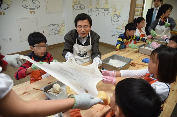 (세종=포커스뉴스) 황교안 국무총리가 어린이날을 하루 앞둔 4일 오후 세종시 연서면 세종 꿈의목장을 방문, 어린이들과 치즈 만들기 체험을 하고 있다. <사진제공=국무총리실>