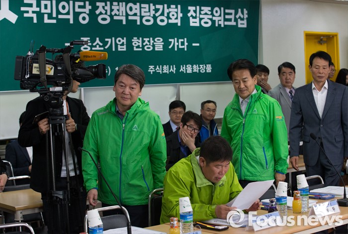 (인천=포커스뉴스) 안철수 국민의당 상임공동대표와 정동영 당선인이 4일 오후 인천 남동구 (주)서울화장품 인천공장에서 열린 국민의당 정책역량 강화 집중 워크샵'중소기업 대표 및 근로자와의 간담회'에 참석하고 있다.