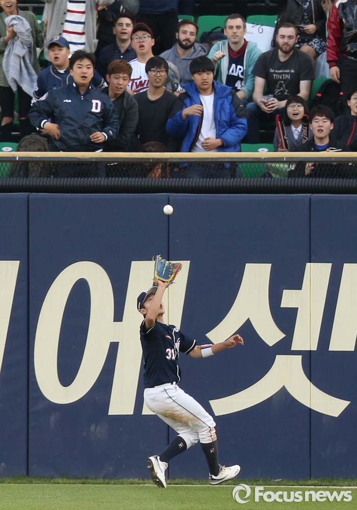 (서울=포커스뉴스) 4일 서울 잠실구장에서 열린 2016 프로야구 두산-LG 경기 1회말 2사 2루에서 두산 중견수 정수빈이 LG 히메네스의 타구를 펜스 앞에서 잡고 있다.