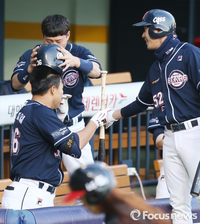 (서울=포커스뉴스) 4일 서울 잠실구장에서 열린 2016 프로야구 두산-LG 경기 1회초 2사 1루에서 우월 2점 홈런을 친 두산 오재일이 덕아웃에서 박세혁과 김재호의 환영을 받고 있다.