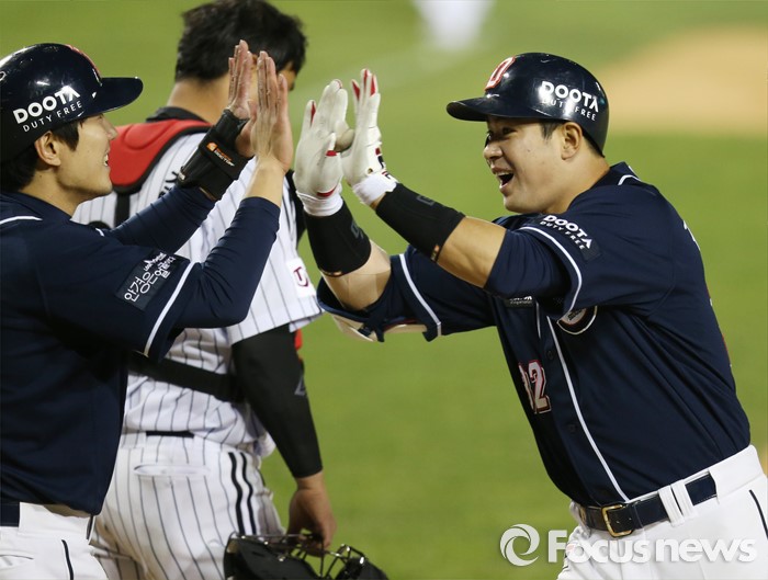 (서울=포커스뉴스) 4일 서울 잠실구장에서 열린 2016 프로야구 두산-LG 경기 6회초 1사 1,3루에서 두산 김재환(오른쪽)이 우월 3점 홈런을 치고 선행 주자 김재호의 환영을 받고 있다.