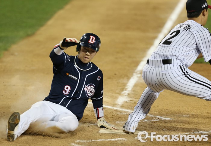 (서울=포커스뉴스) 4일 서울 잠실구장에서 열린 2016 프로야구 두산-LG 경기 6회초 2사 1,2루에서 두산 민병헌의 스트라이크 아웃 낫아웃때 LG 포수 최경철의 1루 송구 실책으로 2루주자 조수행이 홈에서 세이프되고 있다.