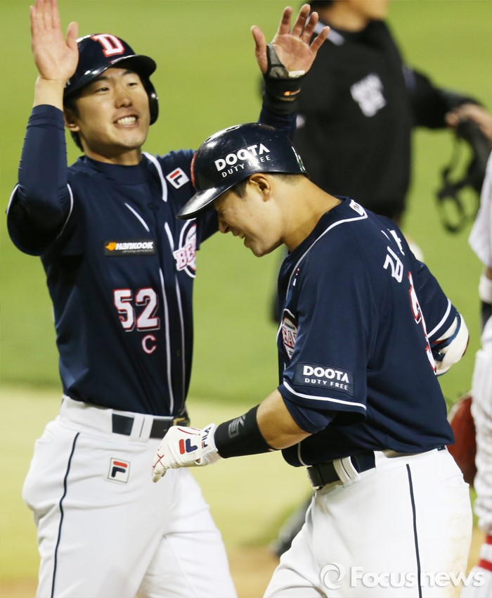 (서울=포커스뉴스) 4일 서울 잠실구장에서 열린 2016 프로야구 두산-LG 경기 6회초 1사 1,3루에서 두산 김재환이 우월 3점 홈런을 치고 선행 주자 김재호의 환영을 받고 있다.