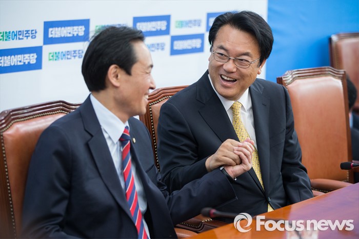 (서울=포커스뉴스) 정진석(오른쪽) 새누리당 신임 원내대표가 5일 오전 서울 여의도 국회 더불어민주당 원내대표실을 예방하여 우상호 더불어민주당 원내대표와 손을 잡고 있다.