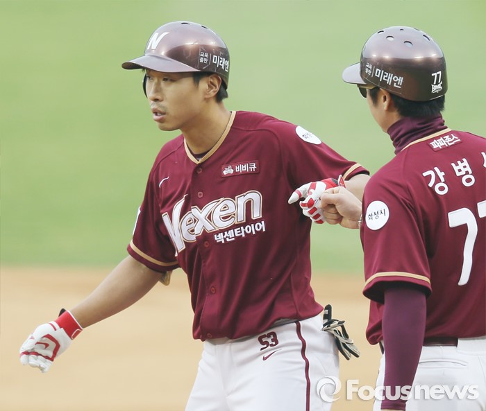 신재영과 고종욱은 각각 200만원을, 김세현은 100만원을 상금으로 받는다.(서울=포커스뉴스) 10일 서울 잠실구장에서 열린 2016 프로야구 넥센-두산 경기 7회초 2사 2루에서 넥센 대타 고종욱이 중전 적시타를 치고 1루에서 강병식 코치와 주먹을 마주치고 있다. 2016.04.10 우정식 기자