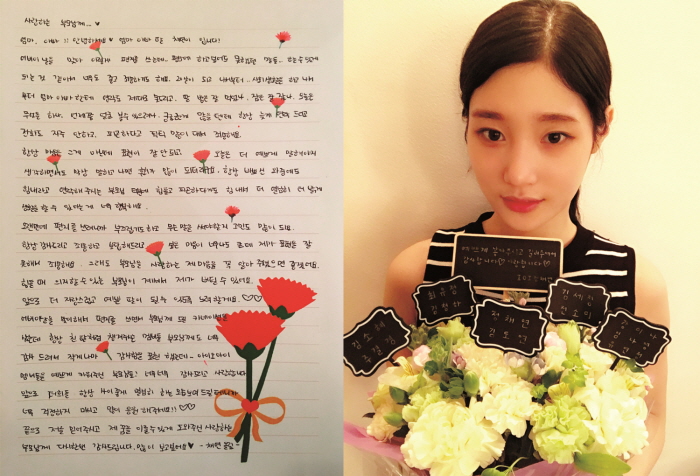 공개된 사진에는 직접 쓴 손편지와 함께 카네이션 꽃바구니를 들고 있는 정채연의 모습이 담겨 있다. 특히 정채연이 들고 있는 꽃바구니에는 아이오아이 멤버들의 이름 역시 쓰여 있어 눈길을 끌었다.