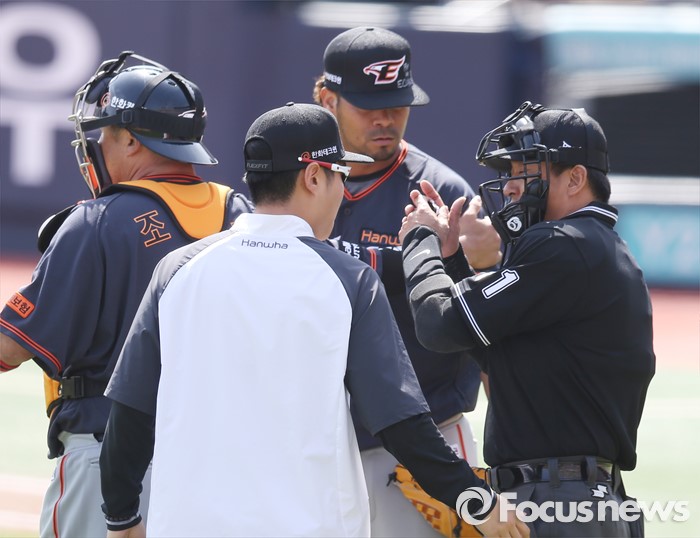 (서울=포커스뉴스) 8일 수원 kt위즈파크에서 열린 2016프로야구 한화-kt 경기에서 2회말 박종철 주심이 한화 투수 로저스의 보크에 대해 설명하고 있다.