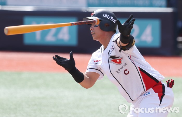 (서울=포커스뉴스) 8일 수원 kt위즈파크에서 열린 2016프로야구 한화-kt 경기 5회말 2사 1,2루에서 kt 박경수가 1타점 우중간 안타를 치고 있다.