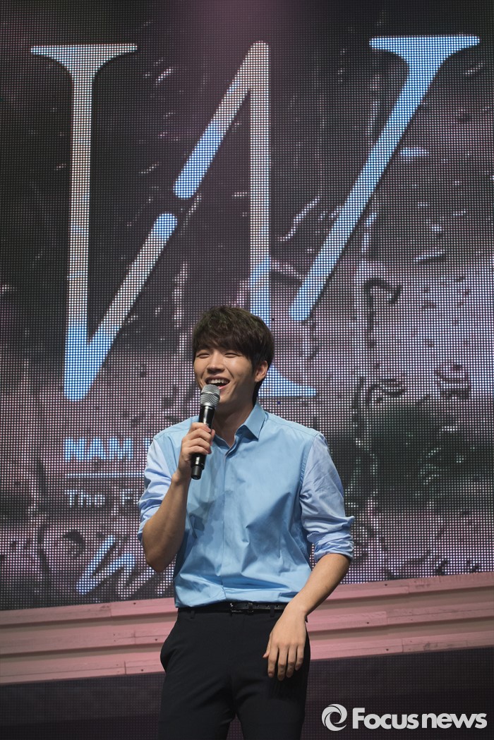 (서울=포커스뉴스) 9일 오후 서울 광진구 예스24라이브홀에서 열린 첫 솔로 미니앨범 발매 기념 프레스 쇼케이스에서 인피니트의 가수 남우현이 사회자의 질문에 답변을 하고 있다.