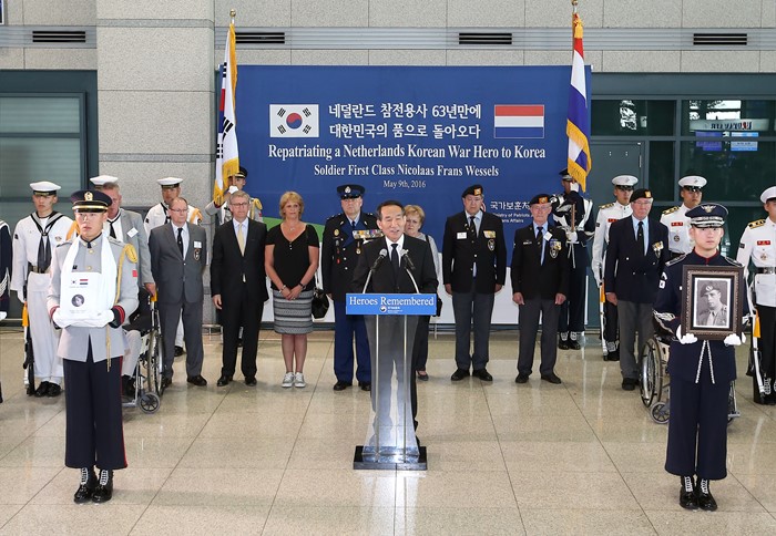(서울=포커스뉴스) 박승춘 국가보훈처장이 9일 오후 인천국제공항에서 열린 6.25전쟁 네덜란드 참전용사 故 니콜라스 프란스 웨셀(Nicolas Frans Wessels)씨의 유해봉환식에 참석해 인사말을 하고 있다. 6·25전쟁에 네덜란드 반호이츠 부대원(일병)으로 참전한 故 니콜라스 프란스 웨셀씨는 1953년 11월에 한국을 떠났지만 자신이 목숨바쳐 지켰던 한국에 대한 애정이 아주 컸으며, 평소 부산 UN기념공원에 묻힌 전우들을 그리워하다 지난해 4월 7일 "한국에 있는 전우들 곁에 잠들게 해 달라"는 유언을 남긴 채 향년 84세의 일기로 삶을 마감했다. 지난해 5월 부산 UN기념공원에 프랑스 참전용사 故 레몽 베나르씨가 사후 안장 실시된 이후 4번째인 웨셀 씨는 오는 12일 오전 부산UN기념공원에 안장된다. <사진제공=국가보훈처>