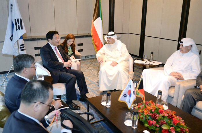 (서울=포커스뉴스) 주형환 산업통상자원부 장관이 9일 오후 서울 종로구 광화문 포시즌호텔에서 아나스 칼레드 알 살레(H.E. Anas Khaled Al-Saleh) 쿠웨이트 석유부 장관(부총리, 재무장관, 석유부장관 직무대리)의 예방을 받고, 한-쿠웨이트 양국간 에너지 분야를 비롯해서 주력산업, 신산업 분야 등 산업전반에 걸친 구체적인 협력방안을 논의하고 있다. <사진제공=산업통상자원부>
